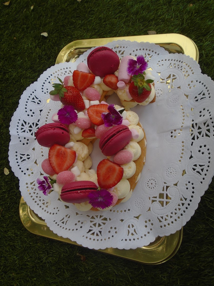 Podemos resumir que este pastel se trata de un sandwich de pasta sablée, relleno de crema diplomática, y cubierto de crema diplomática decorada con frutas, flores, merengues y macarons.